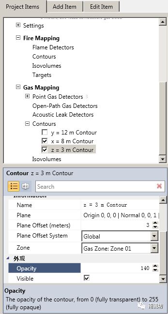 (2)在Project Items选项卡中,Contour中勾选x=8m Contour 和z=3 m Contour,显示不同区域可被监测到的气体探测数量。