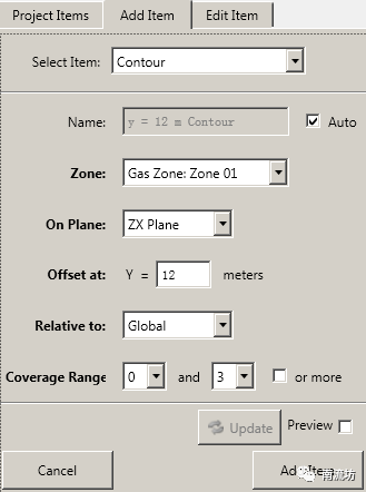 (3)在Add Item选项卡中,Select Item选择Contour,Zone选择Gas Zone: Main Gas Zone,On Plane选择XY Plane,Offset at: Z=填入3,Relative to选择Global,Converage Range选择0 and 3,单击Add Item确认。