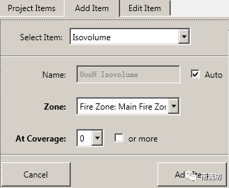 (1)在Add Item选项卡中,Select Item选择Isovolume,Zone选择Fire Zone: Main Fire Zone,At Converage选择0,单击Add Item确认。