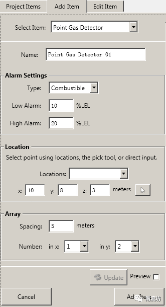 (1)在Add Item选项卡中,Select Item选择Point Gas Detector,Name填入Point Gas Detector 01,在Location中,坐标位置填入(10,8,3)。