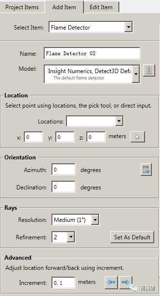 在Add Item选项卡中,Select Item选择Flame Detector,Name填入Flame Detector 01,在Location中,坐标位置填入(-0.26,-0.09,3.59)。