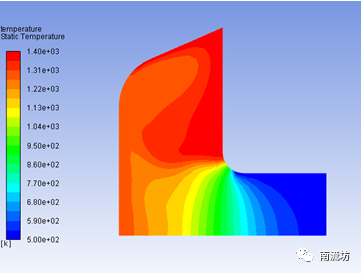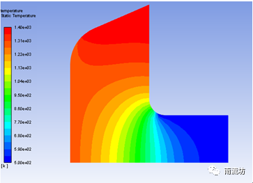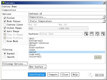 Contous of选择Temperature和Static Temperature,在Options中选择Filled,单击Display按钮,显示云图。