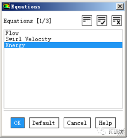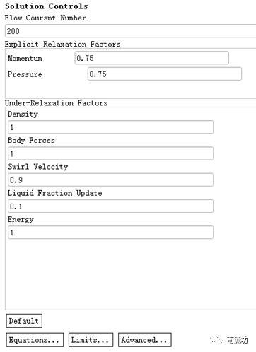 (2)单击主菜单中Solving→Controls→Controls按钮,弹出Solution Controls(松弛因子控制)面板。单击Equations按钮,弹出Equations(方程)对话框,选择Flow 和Swirl Velocity,单击OK按钮确认。