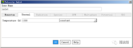 (6)在边界条件面板中,双击bottom-wall弹出边界条件设置对话框。在Thermal选项卡中,Thermal Conditions选择Temperature,Temperature中输入1300,单击OK按钮确认退出。
