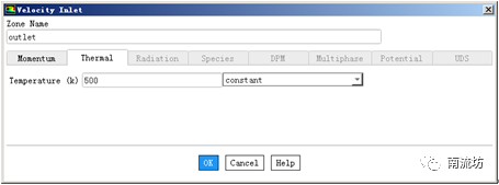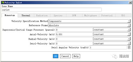 (5)在边界条件面板中,双击outlet弹出边界条件设置对话框。在Velocity Specification Method中选择Components,Axial-Velocity中填入0.001,Swirl Angular Velocity中填入1。
