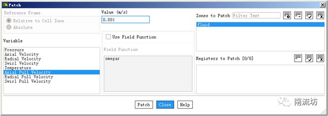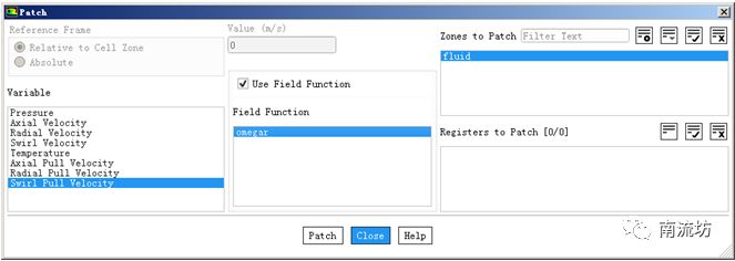 在Variable中选择Swirl Pull Velocity,勾选Use Field Function,在Field Function中选择omegar,Zones to Patch中选择fluid,单击Patch按钮。