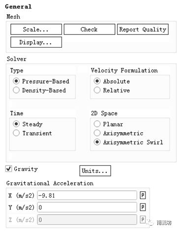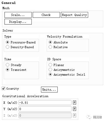 (1)单击命令结构树中General按钮,弹出General(总体模型设定)面板。在2DSpace中选择Axisymmetric Swirl。