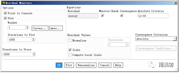 (3)单击主菜单中Solving→Reports→Residuals按钮,弹出Residuals Monitors(残差监视)面板,在Options中选择Plot,单击OK按钮确认退出。
