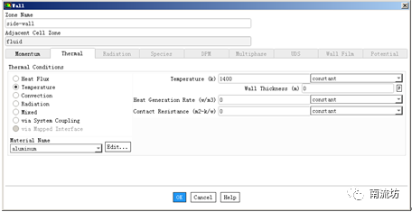 (8)在边界条件面板中,双击side-wall弹出边界条件设置对话框。在Thermal选项卡中,Thermal Conditions选择Temperature,Temperature中输入1400,单击OK按钮确认退出。