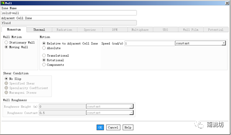 (9)在边界条件面板中,双击solid-wall弹出边界条件设置对话框。在Wall Motion中选择Moving Wall,在Motion中,选择Rotational,Speed填入1.0。
