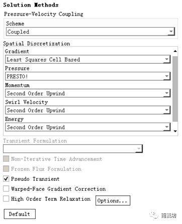 (1)单击主菜单中Solving→Solution→Methods按钮,弹出Solution Methods(求解方法设置)面板。在Scheme中选择Coupled,在Pressure中选择PRESTO!,勾选Pseudo Transient。