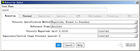 (4)在边界条件面板中,双击inlet弹出边界条件设置对话框。在Velocity Magnitude中填入0.00101。