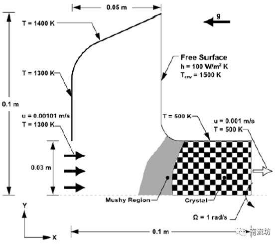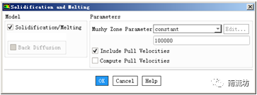 (2)在模型设定面板双击Solidification & Melting按钮,弹出Solidification and Melting(凝固与熔化模型)对话框,勾选Solidification and Melting,勾选Include Pull Velocities,单击OK按钮确认。