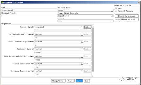 在Create/Edit Materials(材料)对话框中,Cp 填入680,Thermal Conductivity填入30,Viscosity填入0.00553,Pure Solvent Melting Heat填入100000,Solidus Temperature填入1150,Liquidus Temperature填入1150,单击Change/Create按钮完成物质的设定。