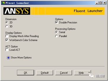 (2)在FLUENT Launcher界面中的Dimension中选择2D,在Option中选择Double Precision,在Display Options中勾选Display Mesh After Reading和Workbench Color Scheme,单击OK按钮进入FLUENT主界面。