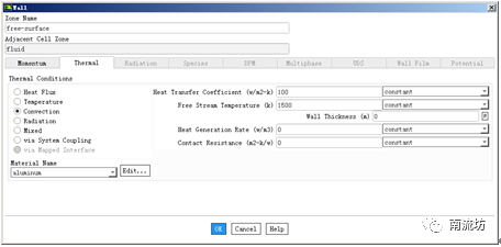 在Thermal选项卡中,Thermal Conditions选择Convection,Heat Transfer Coefficient中输入100,Free Stream Temperature中输入1500,单击OK按钮确认退出。