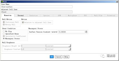 (7)在边界条件面板中,双击free-surface弹出边界条件设置对话框。在Shear Condition中选择Marangoni Stress,Surface Tension Gradient填入-0.00036。