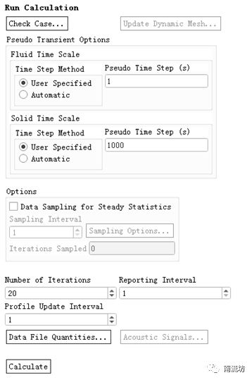 在Time Step Method中,Fluid Time Scale选择User Specified,Solid Time Scale选择User Specified,Number of Iterations中填入20,单击Calculate开始计算。