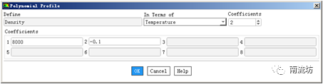 (1)单击主菜单中Setting Up Physics→Materials→Create/Edit按钮,弹出Create/Edit Materials(材料)对话框。在Name中填入liquid-metal,Density选择polynomial,在弹出的Polynomial Profile对话框中,Coefficients填入2,Coefficients中依次填入8000和-0.1,单击OK按钮确认关闭Polynomial Profile对话框。