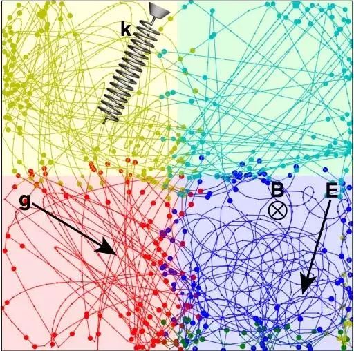 在这个神秘世界中,视场被分为四个象限,每个象限都受不同的物理效应的支配,比如引力(左下)或电磁场(右下)。点和线代表球在环境中的轨迹。基于球如何在环境中运动,AI必须使用它被给予的策略来描述支配球运动的物理定律。| 图片来源: Tegmark and Wu/arXiv