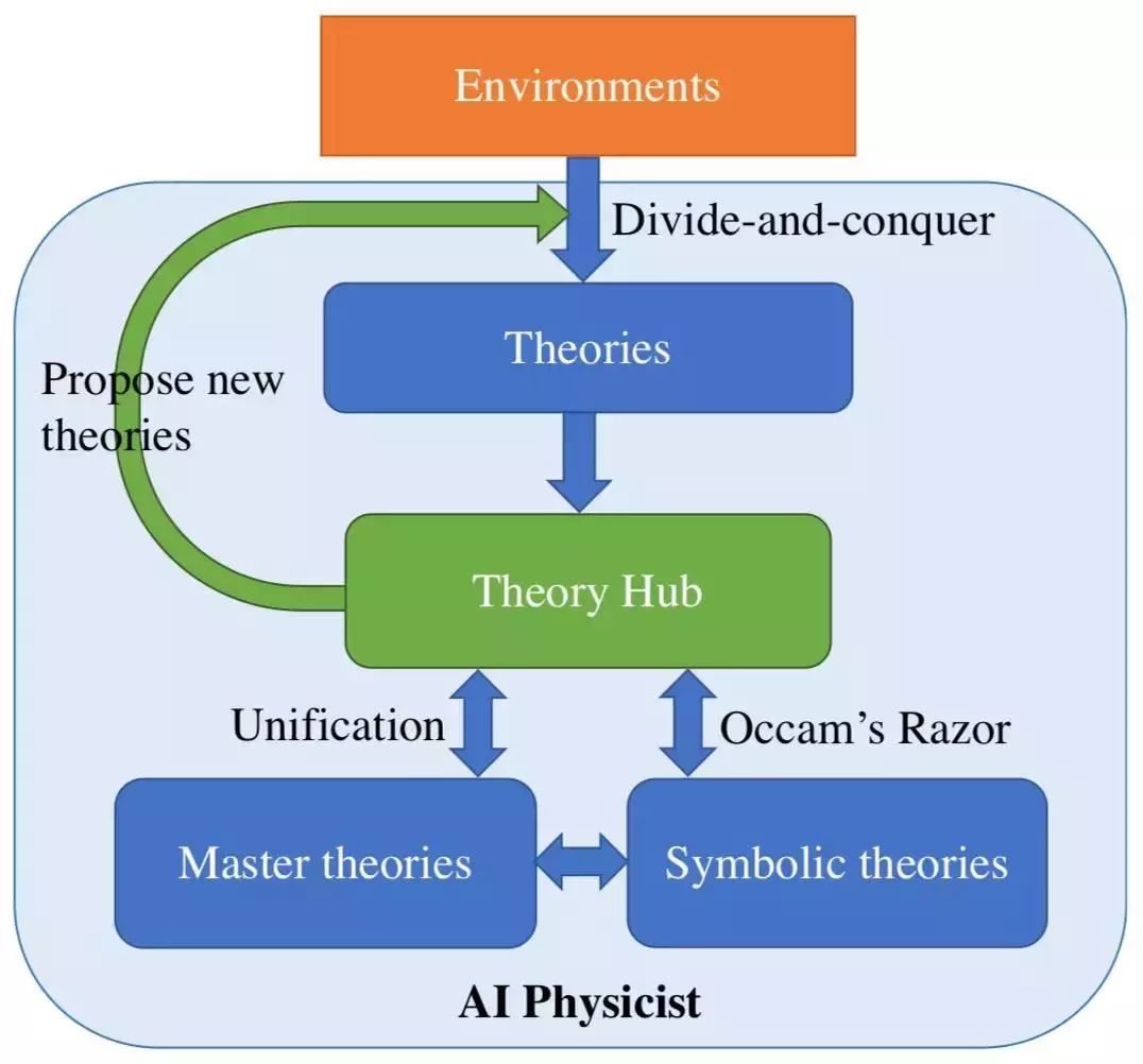AI物理学家的学习架构:在中心是一个储存理论的中心。当遇到新环境时,首先就会检查这个中心,然后提出能解释部分数据的旧理论,以及能够随机初始化其他数据的新理论。所有的这些理论都通过分治法(Divide-and-conquer)训练的,成功的理论和相应的数据就会被添加到理论中心。理论中心有两种组织策略:1. 奥卡姆剃刀(Occam's Razor),以神经网络的形式将所学的理论分解成更简单的符号公式。2. 应用统一(Unification),将符号理论聚类并统一为主理论。符号理论和主理论可被重新添加到理论中心中。| 图片来源: Tegmark and Wu/arXiv