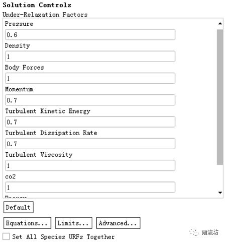 (2)单击主菜单中Solving→Controls→Controls按钮,弹出Solution Controls(松弛因子控制)面板。在Under-Relaxation Factor中Pressure中填入0.6,Turbulence Kinetic Energy中填入0.7,Turbulence Dissipation Ratio填入0.7。
