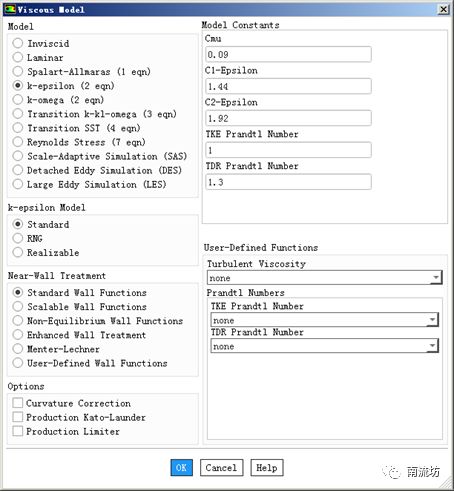 (1)在模型设定面板Models中双击Viscous按钮,弹出Viscous Model(湍流模型)对话框,在Model中选择k-epsilon (2eqn),单击OK按钮确认并关闭对话框。