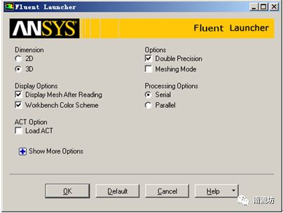 (2)在FLUENT Launcher界面中的Dimension中选择3D,在Option中选择Double Precision,在Display Options中勾选Display Mesh After Reading,Embed Graphics Windows和Workbench Color Scheme,单击OK按钮进入FLUENT主界面。