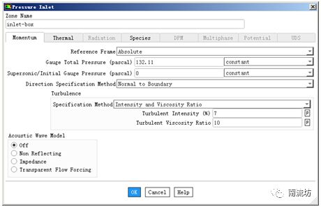 (2)在边界条件面板中,双击inlet-box弹出边界条件设置对话框。在Gauge Total Pressure中输入132.11,在Turbulence中选择Intensity and Viscosity Ratio,其中Turbulent Intensity填入7。在Thermal选项卡中,Total Temperature输入293。在Species选项卡中,Species Mass Fractions输入1,单击OK按钮关闭对话框。