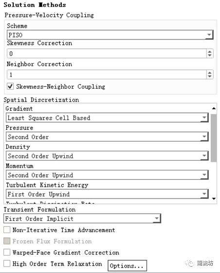 (1)单击主菜单中Solving→Solution→Methods按钮,弹出Solution Methods(求解方法设置)面板。在Scheme中选择PISO,Skewness Correction中填入0。