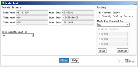 (6)单击主菜单中Mesh→Transform→Scale按钮,在View Length Unit In处选择mm,在Mesh Was Created In处选择mm,单击Scale按钮并关闭窗口。