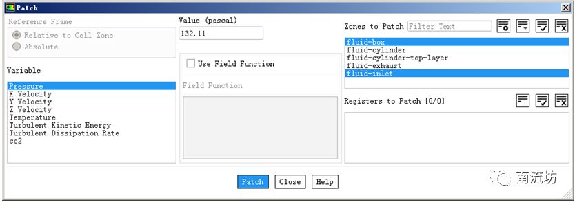 (2)在Solution Initialization(初始化设置)面板中,单击Patch按钮弹出Patch对话框,在Variable中选择Pressure,在Value中输入132.11,在Zones to Patch中选择fluid-box和fluid-inlet,单击Patch按钮。