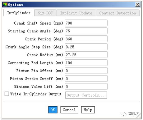 (3)在Options中勾选In-Cylinder,单击Options中Settings按钮弹出Options对话框,如下图所示,填入发动机主要物理参数,单击OK按钮确认并关闭对话框。