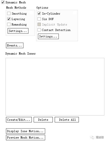 (1)在命令结构树中Dynamic Mesh按钮,弹出Dynamic Mesh(动网格)对话框,勾选Dynamic Mesh,在Mesh Methods中选择勾选Smoothing、Layering和Remeshing。