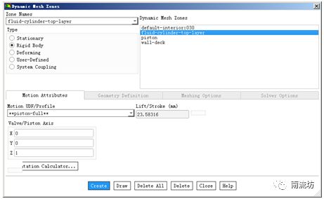 在Zone Names中选择fluid-cylinder-top-layer,在Type中选择Rigid Body,在Motion Attributes选项卡中,Motion UDF/Profile选择piston-full,在Valve/Piston Axis中对应填入(0,0,1),单击Create按钮创建动网格区域。