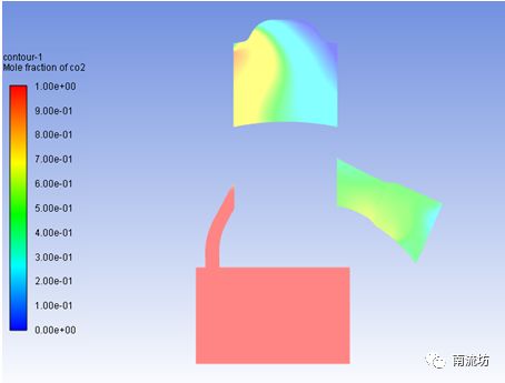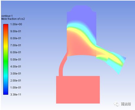 (1)在Graphics下双击Contous弹出Contous(等值线)对话框。Contous of选择Species和Mole fraction of co2,在Options中选择Filled,在Surface中选择Symmetry,单击Display按钮,显示云图。
