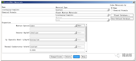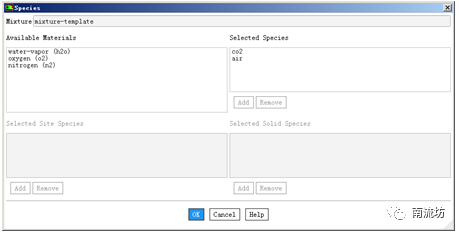 (2)在Create/Edit Materials(材料)对话框中,在Material Type处选择mixture,在Name处填入scavenging-template,在Mixture Species处单击Edit按钮,弹出Species对话框,将carbon-dioxide (co2)和air选入Selected species,将h2o, o2和n2移除,单击OK按钮确认。