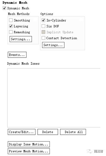 (1)在命令结构树中Dynamic Mesh按钮,弹出Dynamic Mesh(动网格)对话框,勾选Dynamic Mesh,在Mesh Methods中选择勾选Smoothing、Layering和Remeshing。