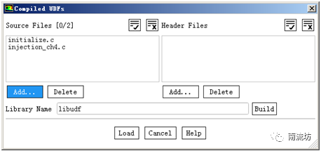 在Source Files下单击Add按钮弹出Select File(导入文件)对话框,选择initialize.c,injection_ch4.c文件,单击OK完成UDF文件导入。