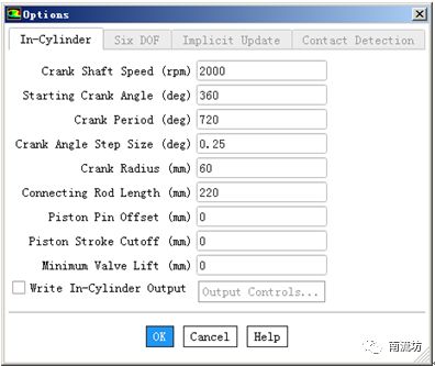 (3)在Options中勾选In-Cylinder,单击Options中Settings按钮弹出Options对话框,如下图所示,填入发动机主要物理参数,单击OK按钮确认并关闭对话框。