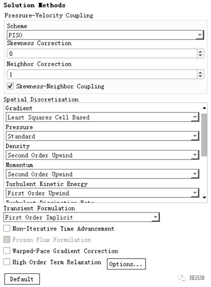 (1)单击主菜单中Solving→Solution→Methods按钮,弹出Solution Methods(求解方法设置)面板。在Scheme中选择PISO,Skewness Correction中填入0,在Pressure中选择Standard。
