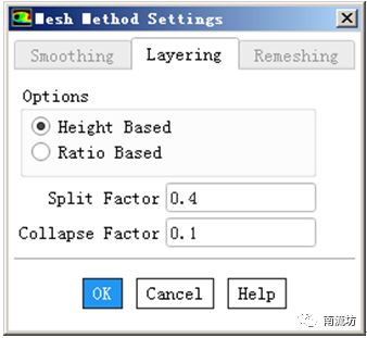 (2)单击Mesh Methods中Settings按钮弹出Mesh Method Settings对话框,在Remeshing选项卡中,勾选Region Face,在Layering选项卡中,Collapse Factor中填入0.1,单击OK按钮确认并关闭对话框。