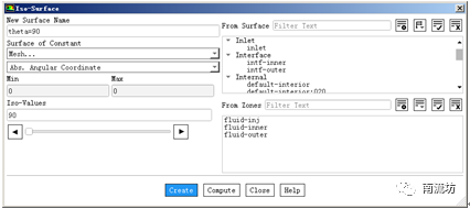(2)单击主菜单中Postprocessing→Surface→Create→Iso-Surface按钮,弹出Iso-Surface(等值面)对话框,New Surface Name中填入y=.02,Surface of Constant中选择Mesh和Abs. Angular Coordinate,Iso-Values中填入90,单击Create按钮确认。