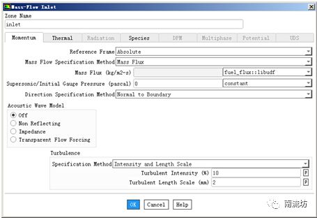 (2)在边界条件面板中,单击选择inlet,在Type中选择mass fow inlet,弹出边界条件设置对话框。在Mass Flow Specification Method中选择Mass Flux,在Mass Flux中选择fuel_flux::libudf,在Normal to Boundary中选择Direction Specication Method,在Specification Method中选择Intensity and Length Scale,在Turbulent Length Scale中填入2。