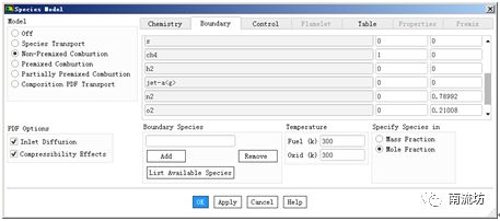 在Boundary选项卡中,在Specify Species in中选择Mole Fraction,设置以下物质的摩尔百分比。