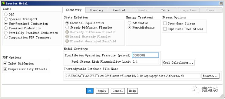 在PDF Options中勾选Inlet Diffusion和Compressibility Effects,在Chemistry选项卡中,在Energy Treatment中选择Non-Adiabatic,在Equilibrium Operating Pressure中填入3000000。