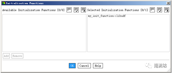 单击Edit按钮弹Adjust Function对话框,在Available Adjust Functions中选择my_init_function::libudf,单击Add按钮并单击OK按钮确认。