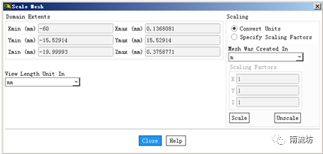 (6)单击主菜单中Mesh→Transform→Scale按钮,弹出Scale Mesh对话框,在View Length Unit In选择mm,保持默认值并关闭窗口。
