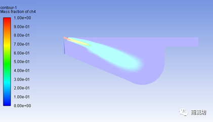 (1)在Graphics下双击Contous弹出Contous(等值线)对话框。Contous of选择Species和Mass fraction of ch4,在Options中选择Filled,在Surface中选择theta=90,单击Display按钮,显示云图。
