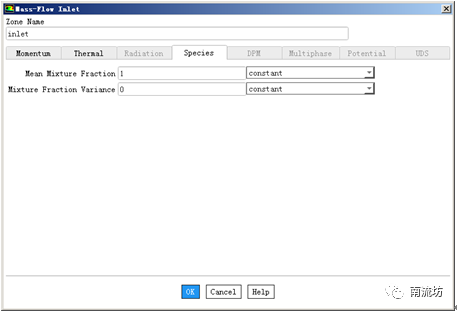 在Species选项卡中,Mean Mixture Fraction填入1,单击OK按钮关闭对话框。